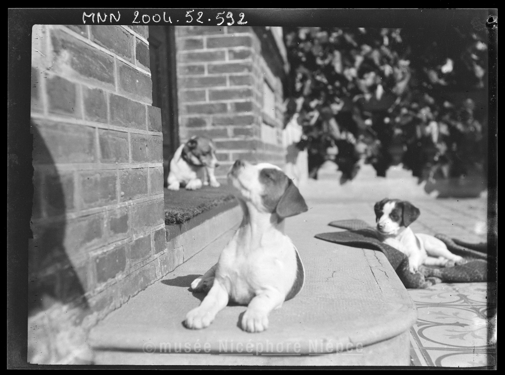 Trois chiens sur la terrasse du château