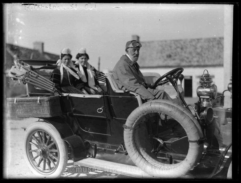 Robert DEMACHY posant avec deux bretonnes dans son automobile