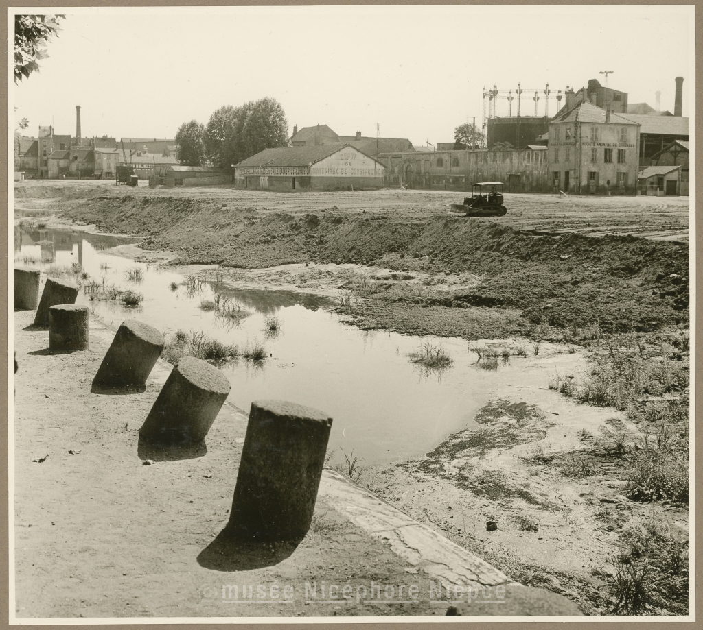 Ancien bassin du canal du centre : commencés fin juin 1959, les travaux de comblement du bassin sont menés activement tout au cours de l'été