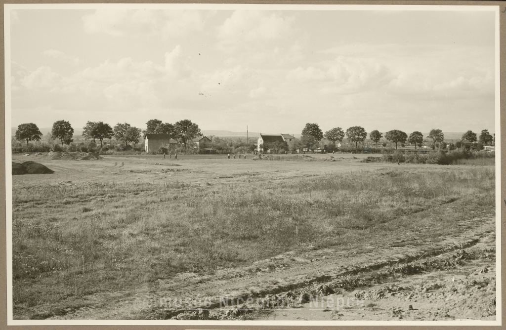 Travaux du futur parc des sports Vue en direction de l'Ouest sur le terrain d'entraînement de rugby 12 Octobre 1959