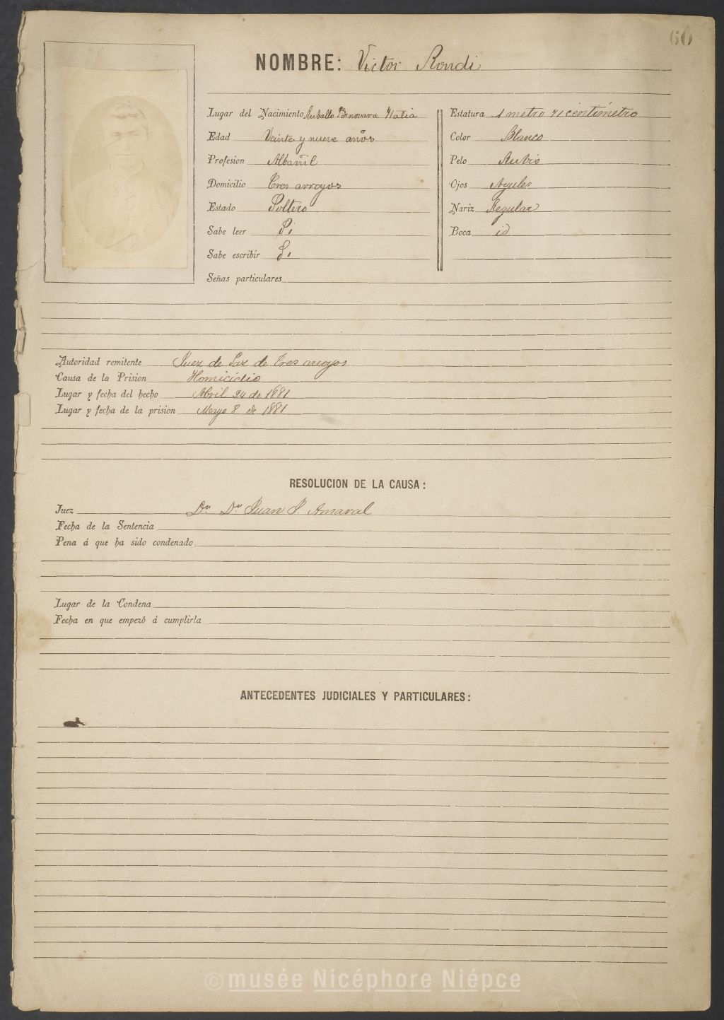 Fiche anthropométrique d'un condamné en Argentine, avec sa photographie