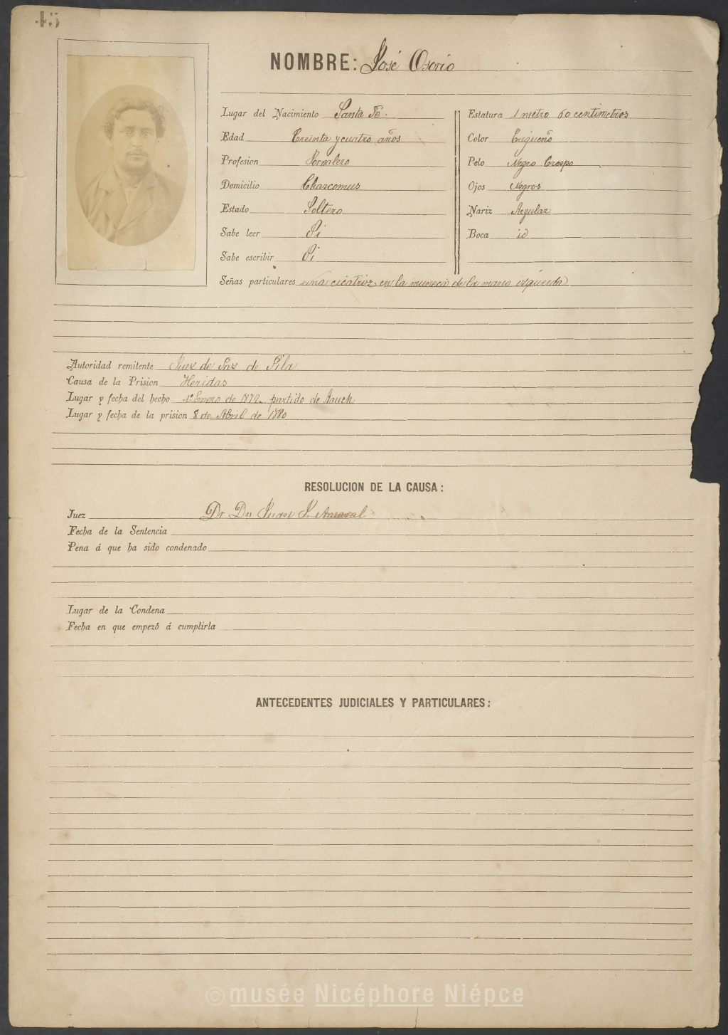 Fiche anthropométrique d'un condamné en Argentine, avec sa photographie