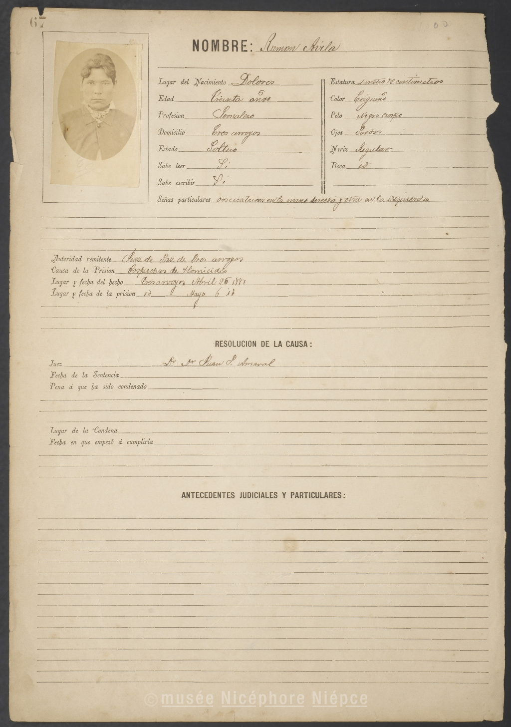 Fiche anthropométrique d'un condamné en Argentine, avec sa photographie