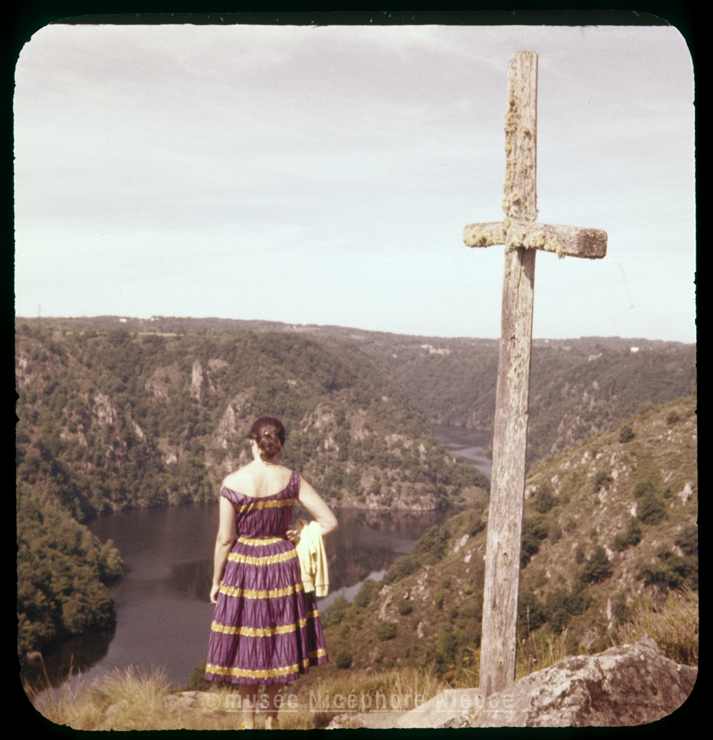 Simone à côté d'un calvaire, devant un lac, Auvergne