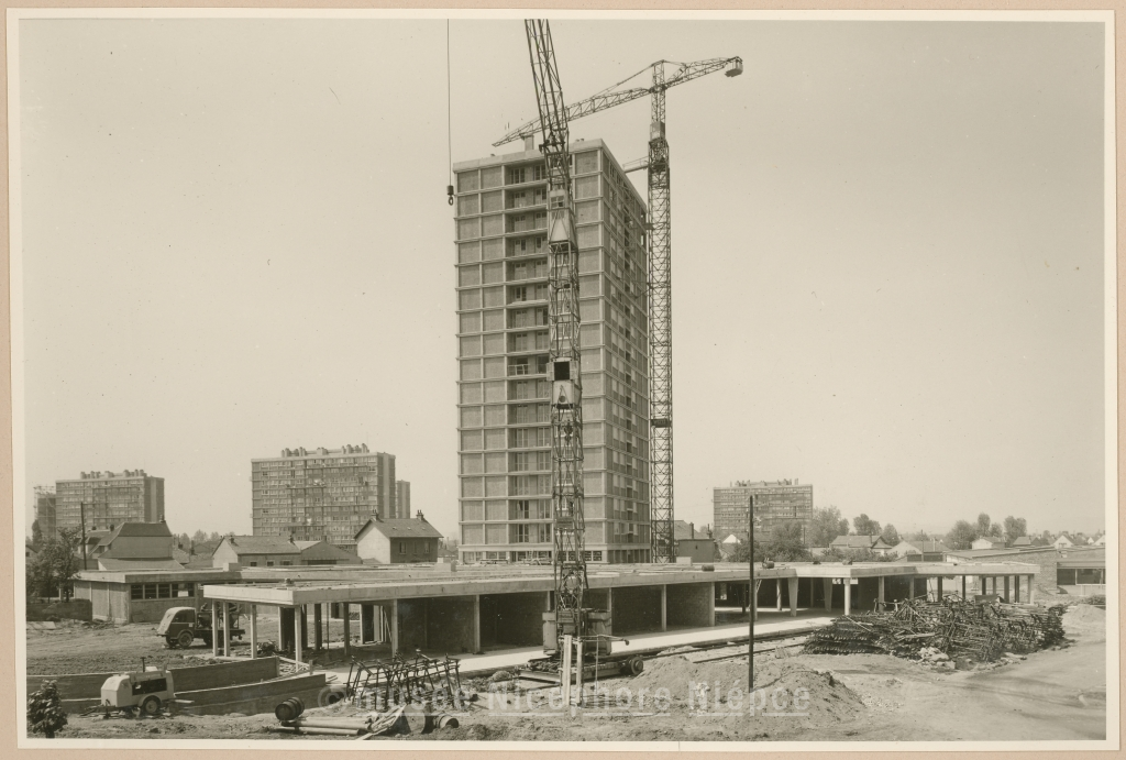 Travaux de l'immeuble Tour et du Centre Commercial de l'Aubépin 4 Mai 1960
