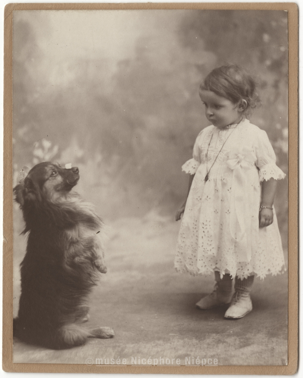 Fillette avec un chien en studio
