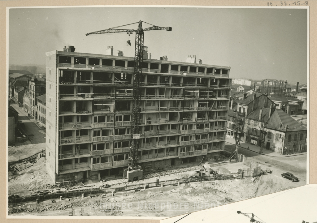Construction de l'immeuble de la Sté Conventionnée "Union pour l'habitation" sur l'emplacement de l'ancien bassin du Linguet, au carrefour st-Cosme 19 Mars 1962