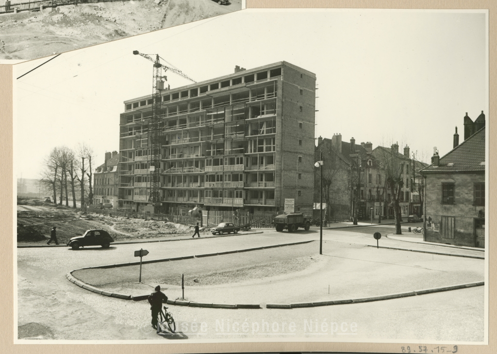 Construction de l'immeuble de la Sté Conventionnée "Union pour l'habitation" sur l'emplacement de l'ancien bassin du Linguet, au carrefour st-Cosme 19 Mars 1962