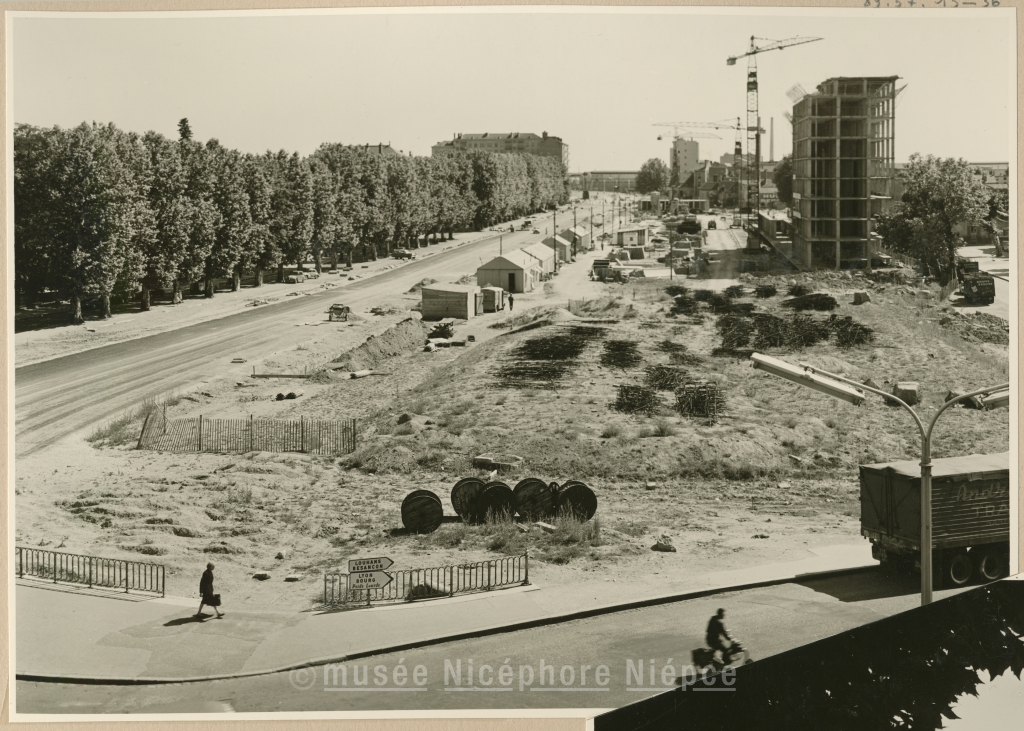 Construction sur l'ancien bassin du canal Vue prise de l'ancien pont de la Colombière Septembre 1962