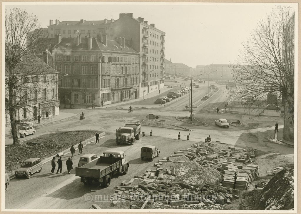 Travaux du carrefour rue Porte de Lyon, grande rue St-Cosme et nouvelle Avenue Nicéphore Niépce 20 février 1963