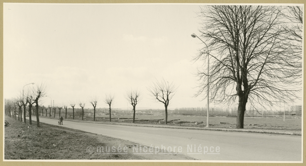 Route de St-Cosme au Pont-Paron en bordure Nord vont s'élever les futurs immeubles des Prés-Devigny (dans le lointain, le quartier des Charreaux ; à l'extrème droite, le lycée de Filles) Février 1965