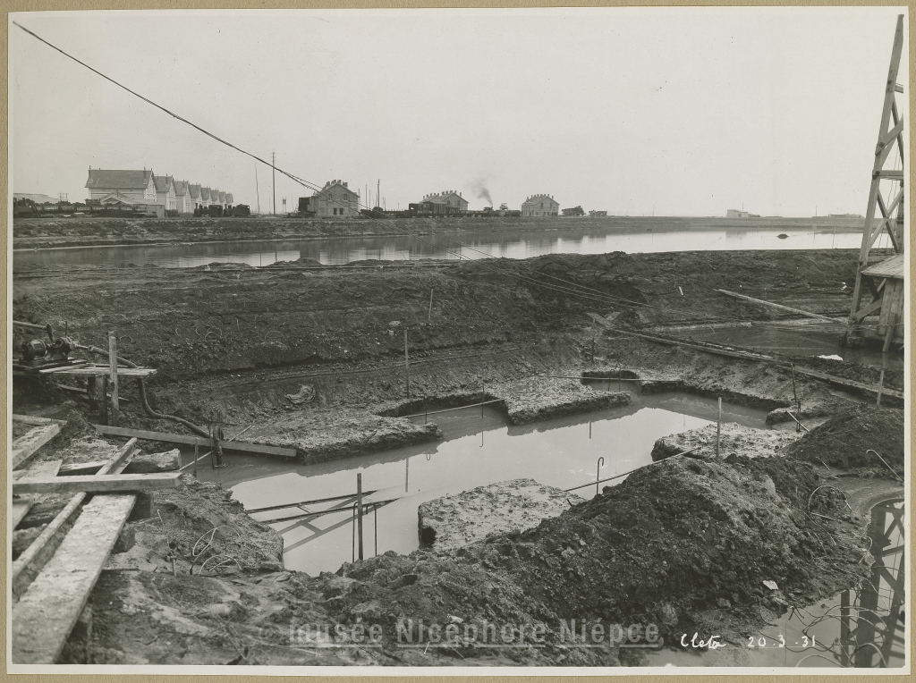 Travaux de fondation de la nouvelle usine de "L'Air liquide".- Au second plan : maisons ouvrières de l'usine centrale thermique.- 20 Mars 1931