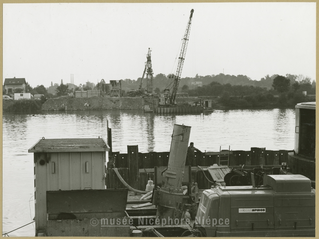 Futur Pont Sud sur la Saône : début des travaux en octobre 1973 Vue prise depuis la rive gauche, dans le lointain, Lux