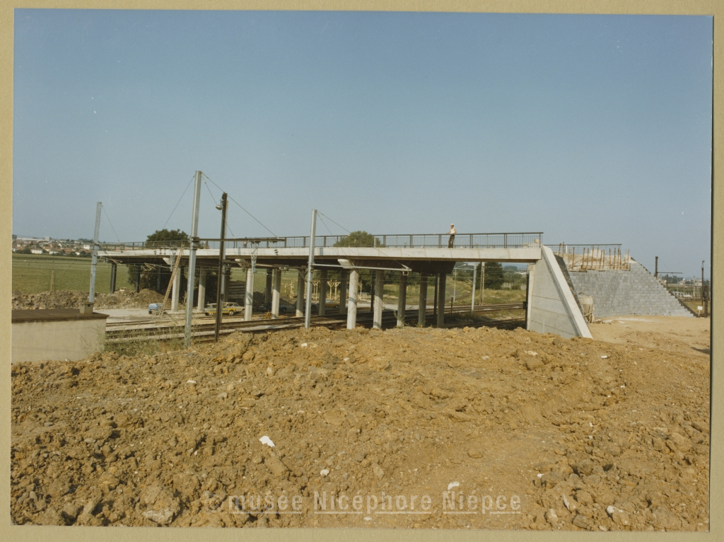 En août 1975, état des travaux de construction d'un grand pont de la future rocade Nord-Ouest, au dessus des voies ferrées de la S.N.C.F.