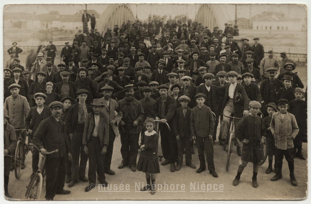 Groupe d'ouvriers du Petit-Creusot à la sortie du pont Jean Richard, à Chalon-sur-Saône