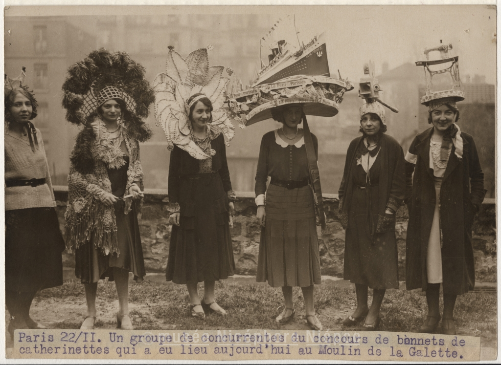 Paris 22/11. Un groupe de concurrentes du concours de bonnets de catherinettes qui a eu lieu aujourd'hui au Moulin de la Galette.