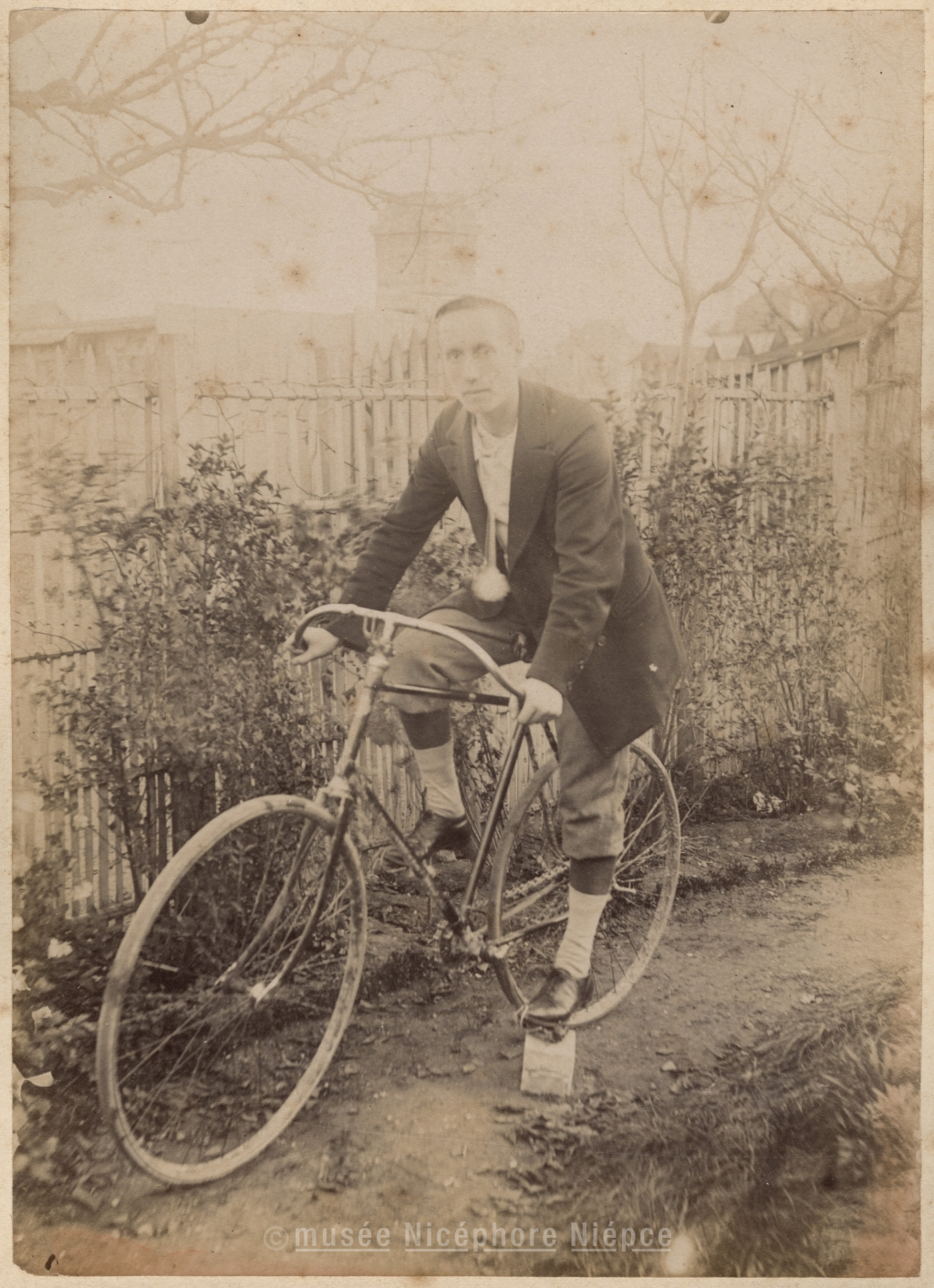 Jeune homme sur une bicyclette, dans un jardin