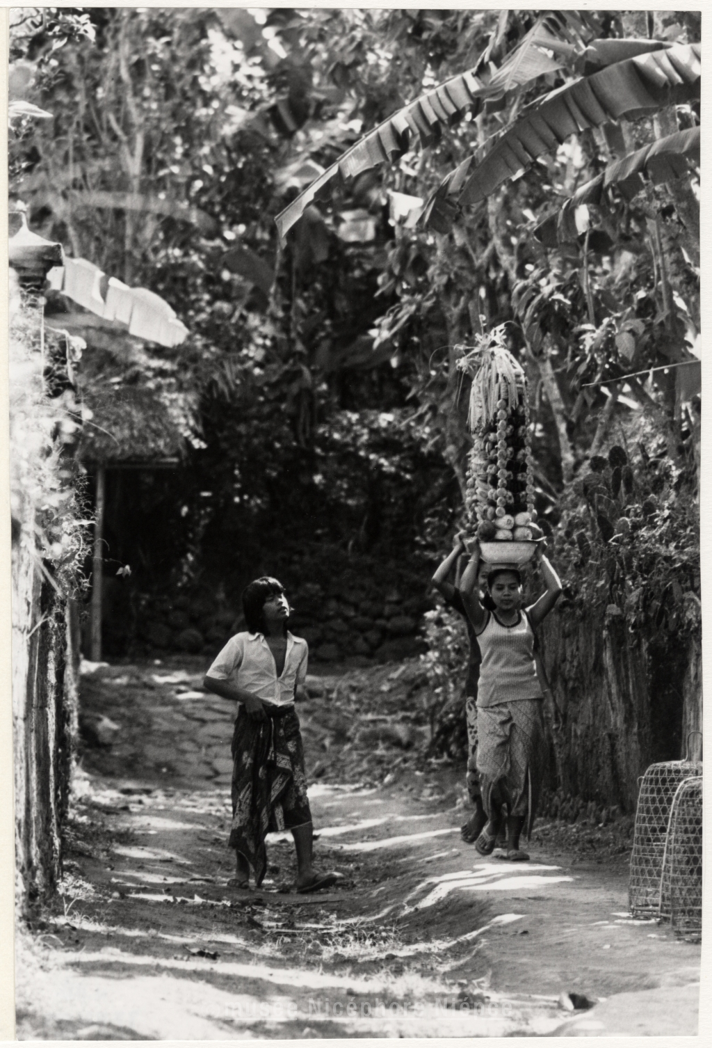 Jeunes filles asiatiques portant des coupes de fruits sur la tête