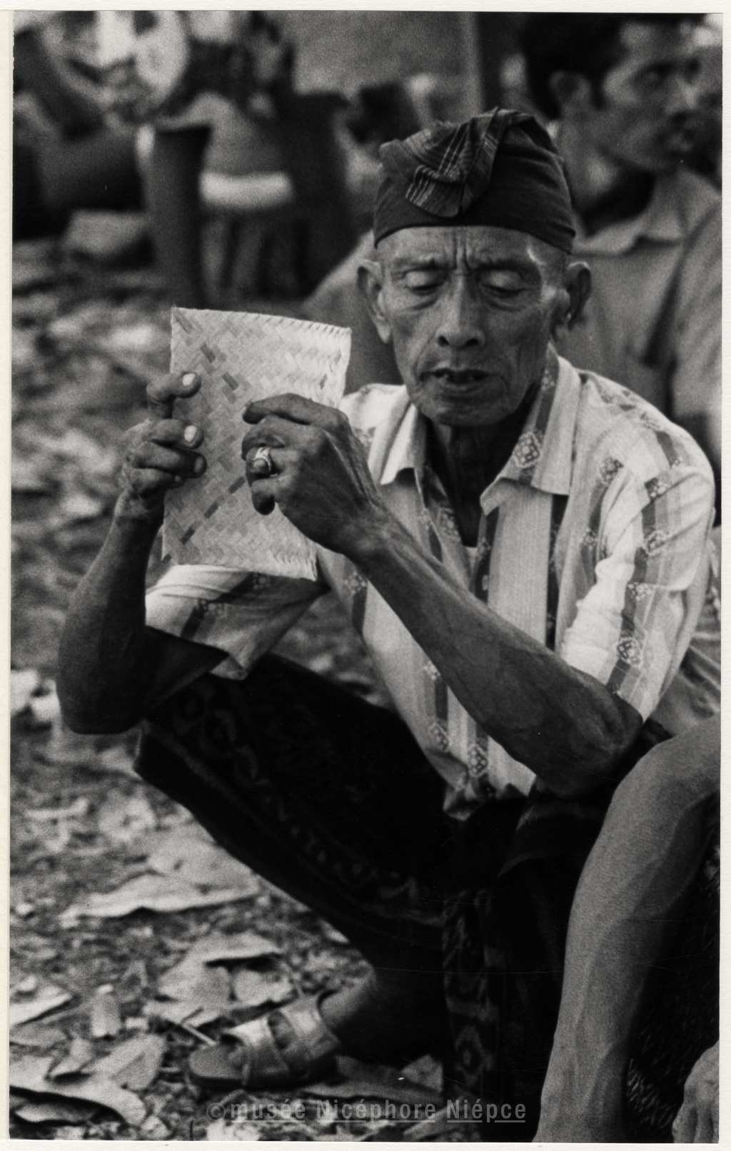 Personnage asiatique accroupi, tenant un carré de paille tressée