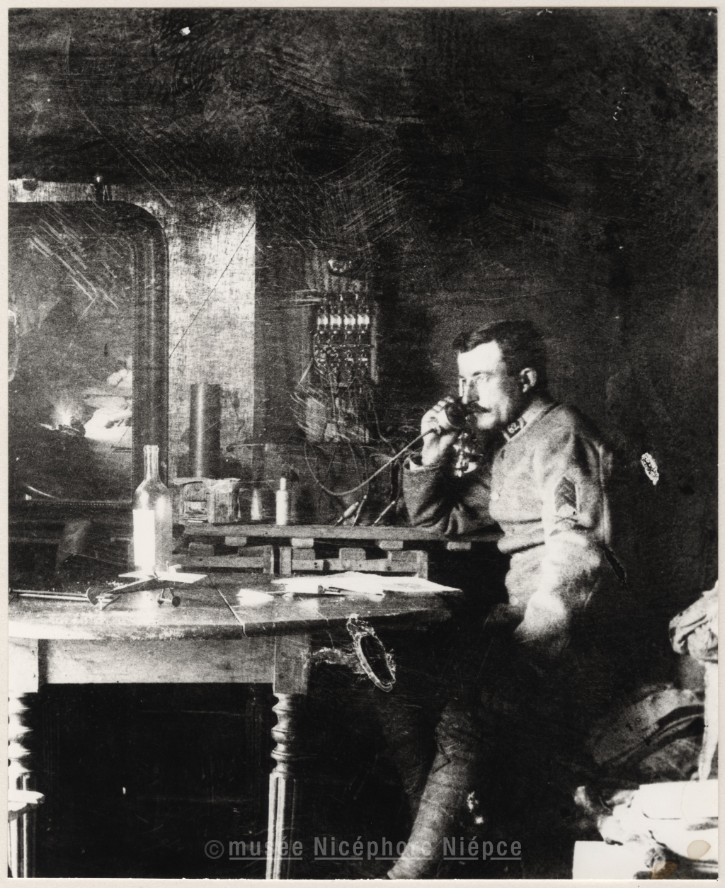 Soldat assis devant un poste de transmission