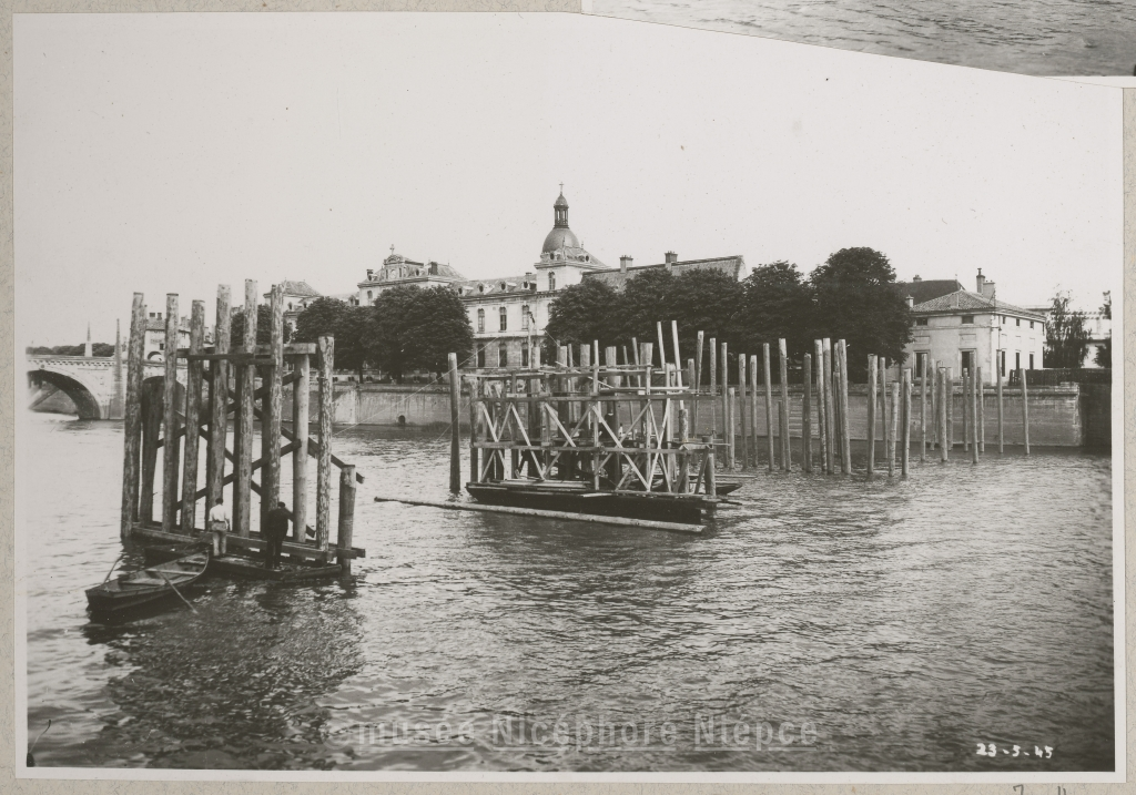 Construction d'un pont de bois provisoire sur la Saône 23 Mai 1945