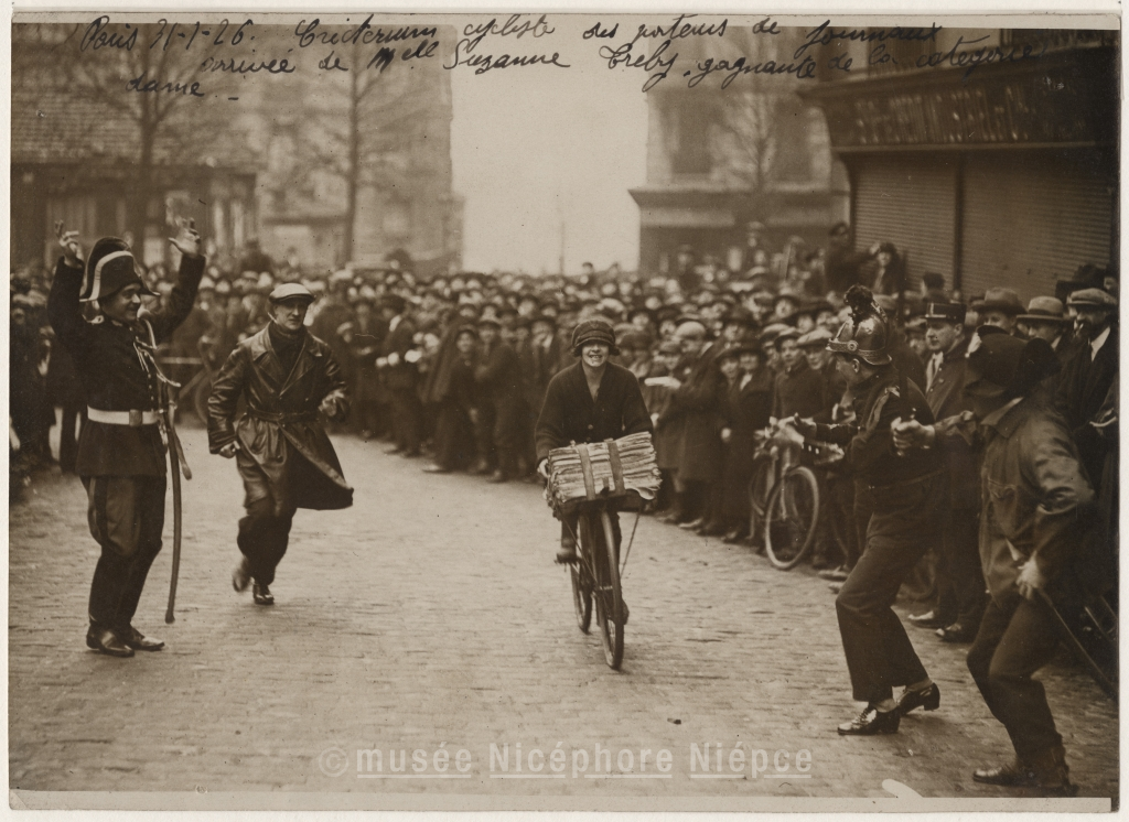 Paris 31-1-26. Critérium cycliste des porteurs de journaux / arrivée de Melle Suzanne Treby, gagnante de la catégorie / dame -