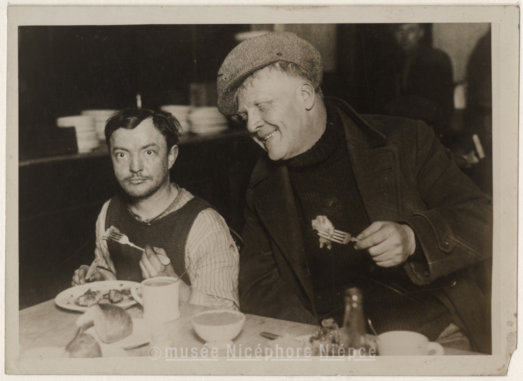 Chaliapine, le chanteur d'opéra / bien connu qui a résidé dans les / villes russes dans les bas quartiers / a tenu de comparer ces derniers / avec ceux de New-York, c'est / ainsi que notre photo le montre, / mangeant avec un type de personnage / de ces quartiers ou il y a / même dormi