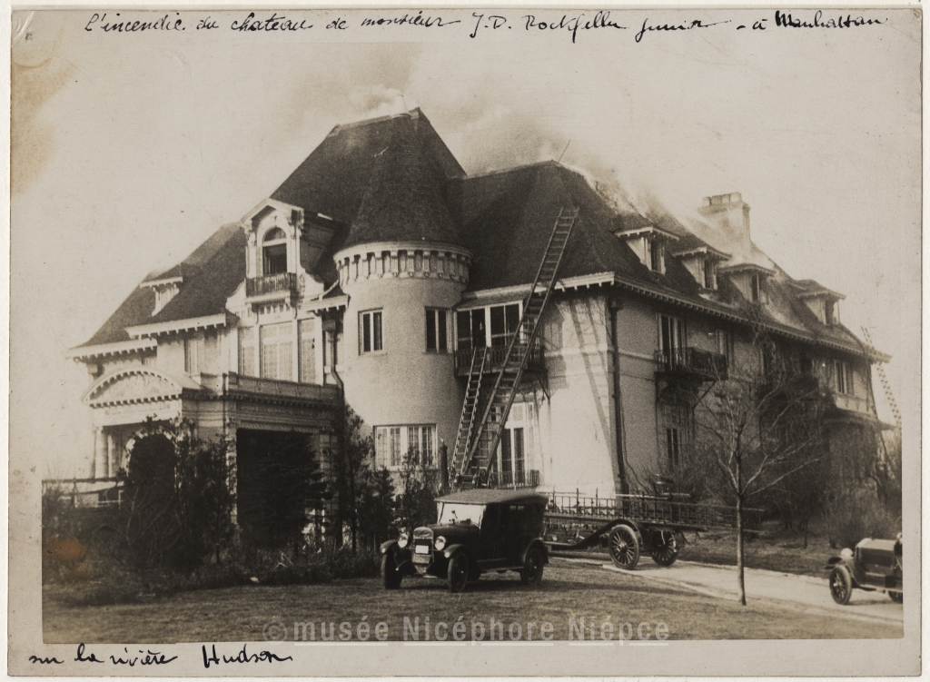 L'incendie du château de / Monsieur John D. Rockfeller / jeune sur les bords de la / rivière Hudson à Manhattan