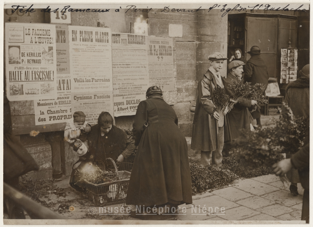 Fête des Rameaux à Paris / Les marchands de Buis devant / les panneaux électoraux devant / l'Eglise St Eustache