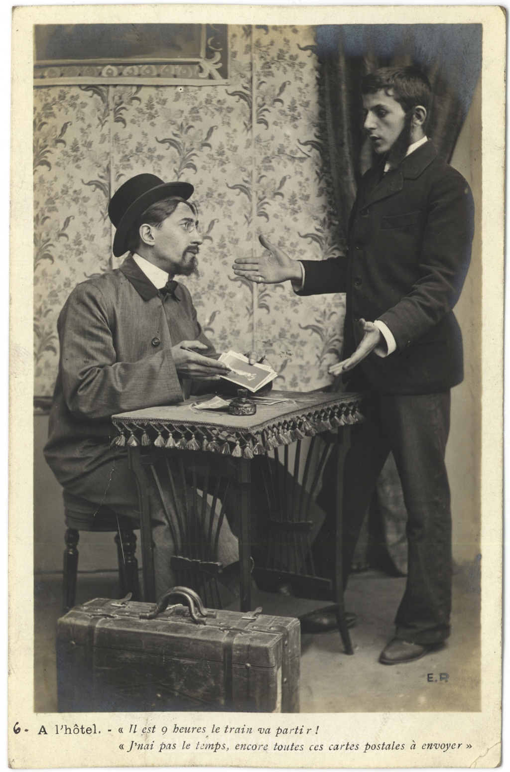 6. A l'hôtel. - Il est 9 heures, le train va partir! / J'nai pas le temps, encore toutes ces cartes postales à envoyer