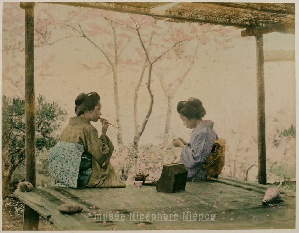 scène - de dos - arbre - assis - jeune fille - ombrelle - ? - kimono - Japon - en fleurs - pipe - service à thé - Tamamura KOZABURO