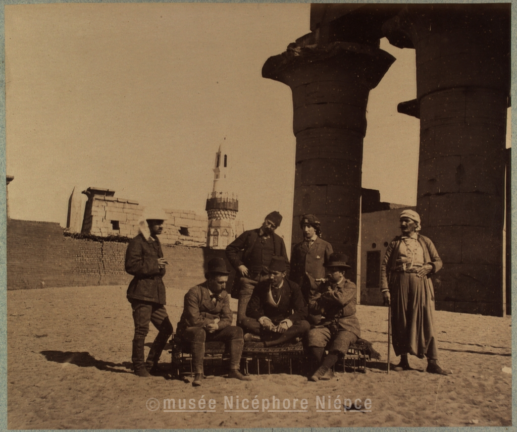Groupe d'archéologues devant les ruines de Louxor en Egypte