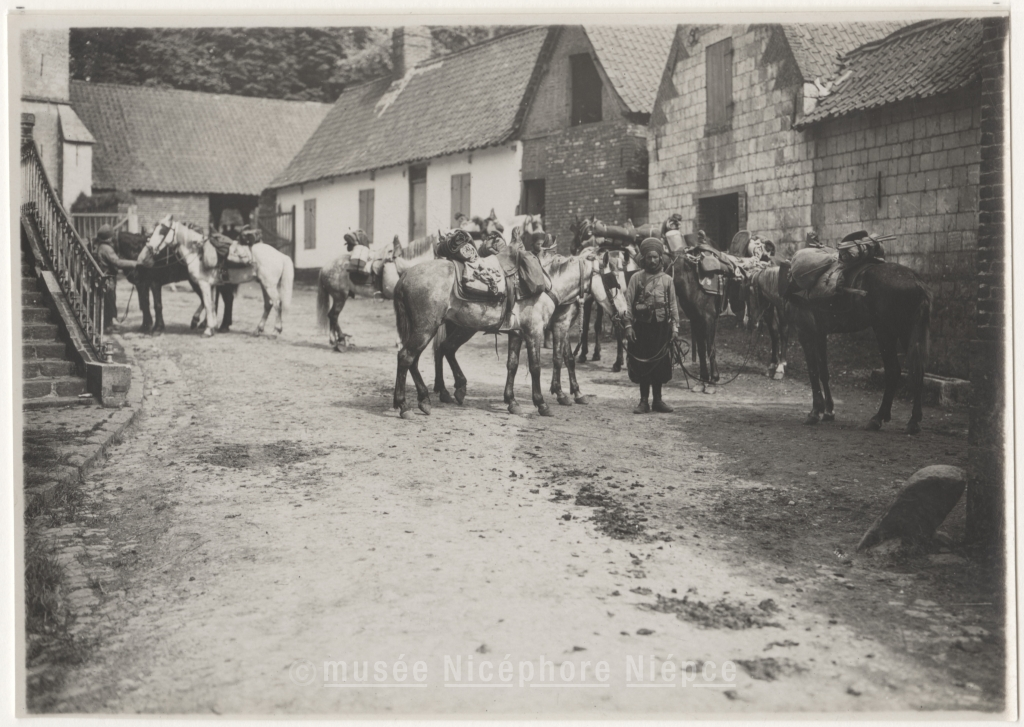 Troupe de cavaliers à l'arrêt dans un village
