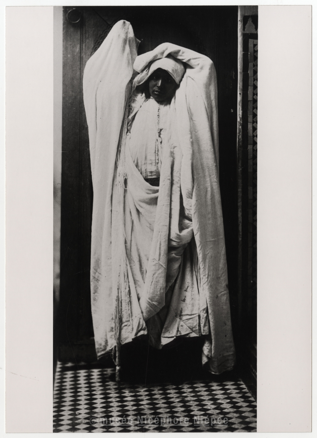 en pied - femme - portrait - costume traditionnel - en pose - voile - geste - suite de scènes - Maroc - Marocain - G. DE CLERAMBAULT