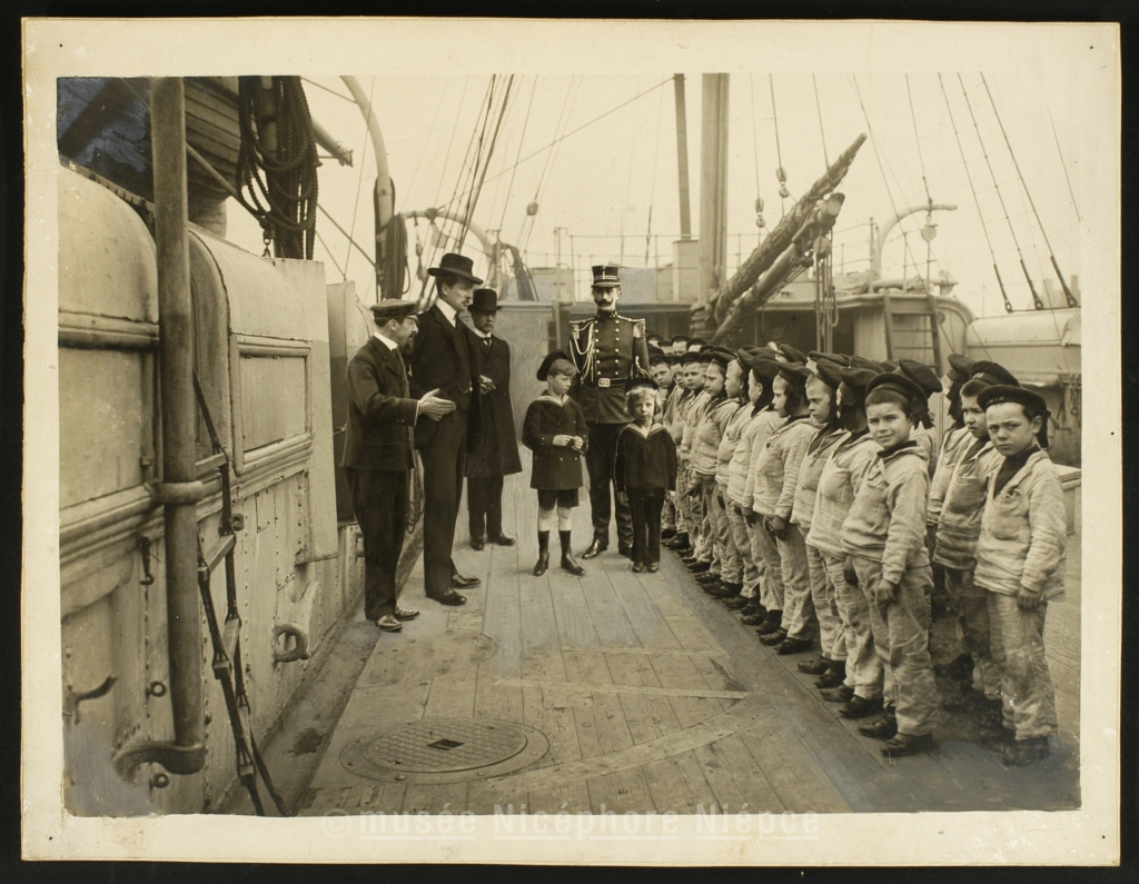 Revue de jeunes matelots sur le pont d'un bateau par le Roi Albert
