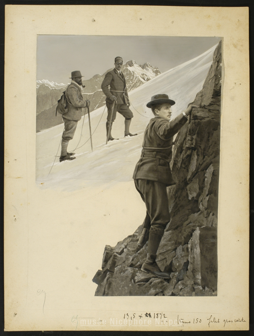 Photomontage représentant le Roi Albert lors d'une escalade en haute montagne