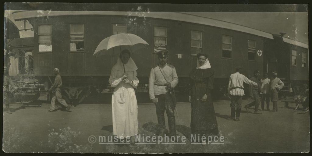 portrait collectif - en pied - quai - reine - en pose - militaire - wagon - infirmière - ombrelle - Bulgare - Mandchourie - Anonyme - CHUSSEAU-FLAVIENS