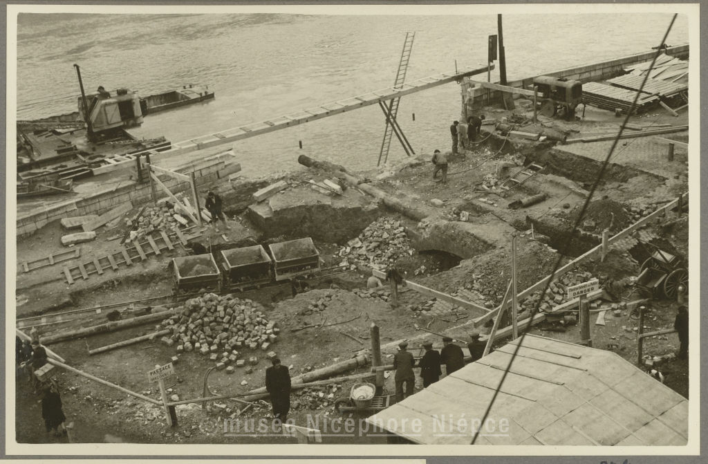 Fouilles pour l'établissement des fondations, rive droite, de la culée du nouveau pont Saint-Laurent 27 Mars 1951