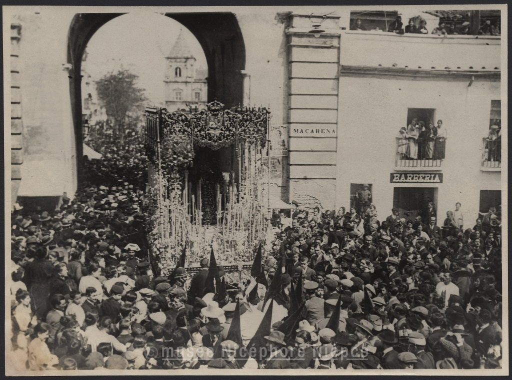 La semaine sainte à Séville. La populaire image de la Vierge de la Esperanza passant sous la fameuse porte de la Macarena