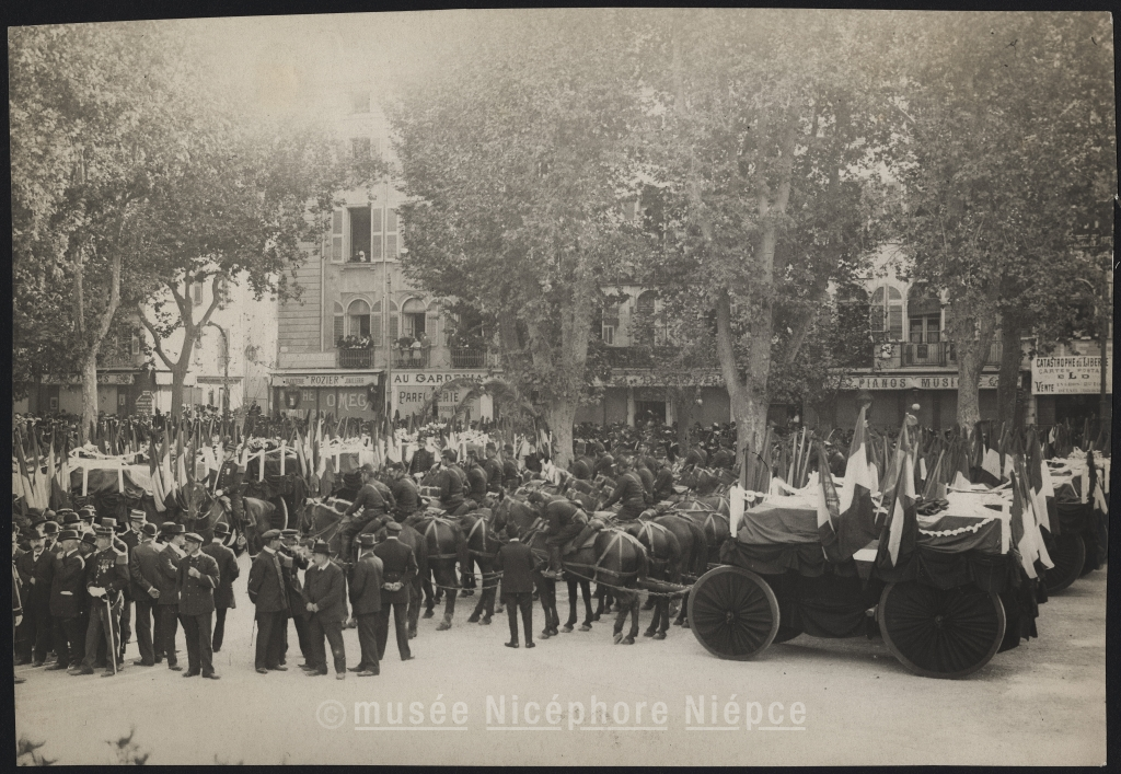 Catastrophe du Liberté. Sur la place d'armes de Toulon, les cercueils exposés