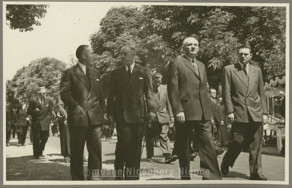 Monsieur le Ministre Jean Moreau visite la Foire-Exposition, entouré de M. Nouelle, Maire, M. Moynet, député de la S. et L., M. Charles Gros, président du Comité 22 Juin 1952